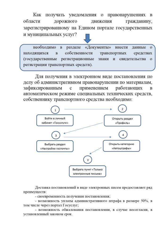 Для получения собственнику транспортного средства необходимозарегистрироваться на Едином портале государственных и муниципальных услуг,в разделе «Документы» внести данные о находящихся в собственности транспортных средствах (государственные регистрационные знаки и свидетельства о регистрации транспортных средств), далеев разделе «Профиль» осуществить настройку доставки госпочты категории «Автоштрафы» путем выбора пункта «Только электронные письма».
