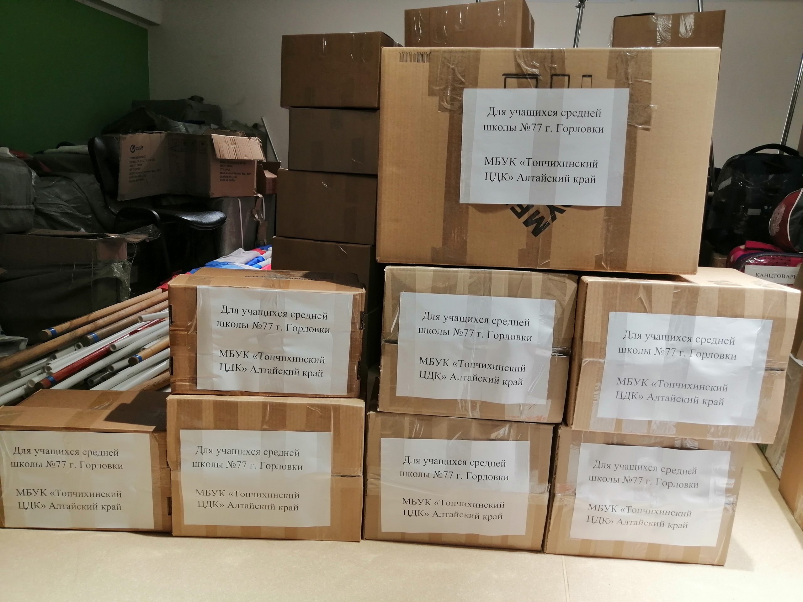 Хочется выразить огромную благодарность руководителю КФХ Валерию Михайловичу Шроо из п. Топольного, а также народному коллективу русской песни «Россияночка», коллективу военного комиссариата Топчихинского и Калманского районов, предпринимателю Олегу Яковлевичу Тутынину и всем другим неравнодушным людям, откликнувшимся на беду ребят из города Горловка. Пока шёл сбор средств, прорабатывался механизм доставки нашей помощи к самой линии фронта на Донбассе. Сотрудники районного музея через алтайское отделение общественной организации «Женщины России» выяснили, что шефство над городом Горловкой взял Кузбасс, то есть Кемеровская область.