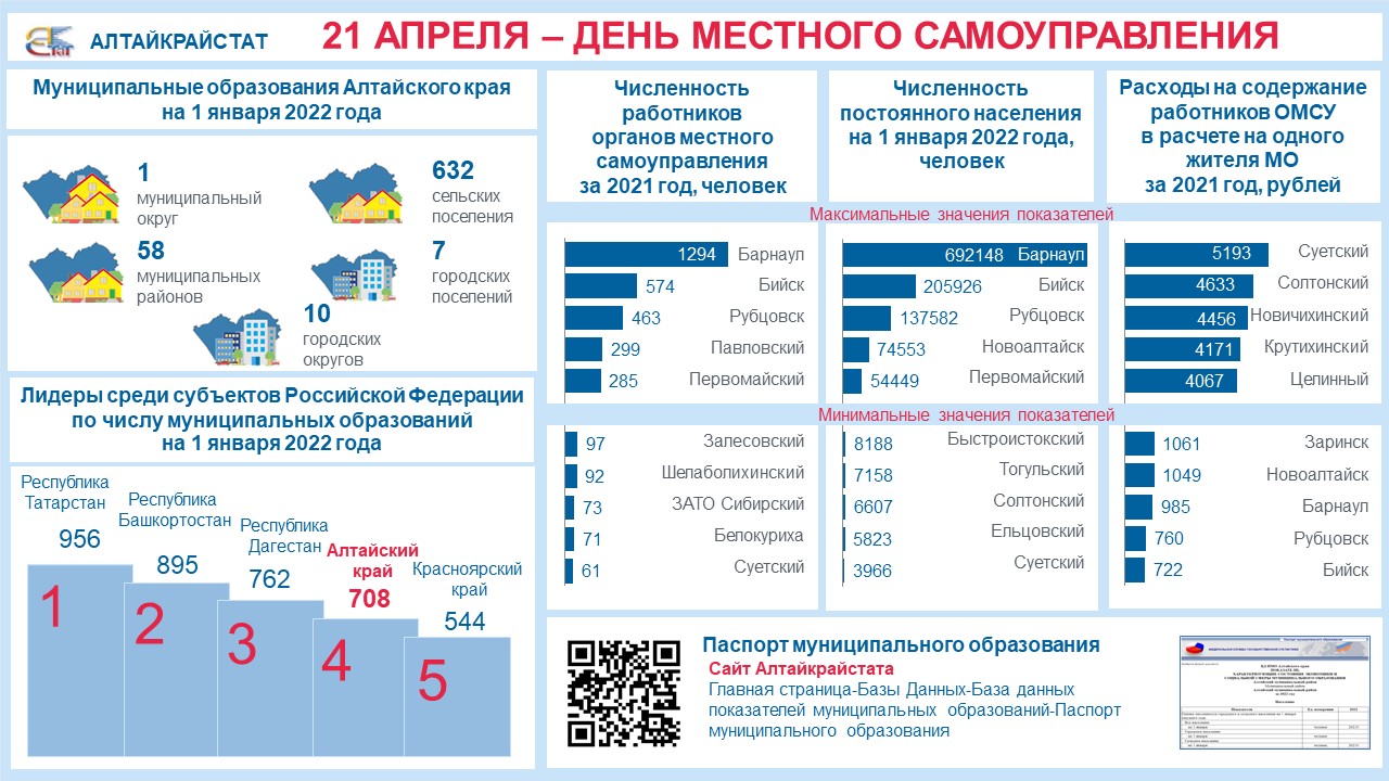 В разделе «Муниципальная статистика» на сайте Алтайкрайстата размещены рубрики для получения информации о муниципальных образованиях края. Основным источником данных является База данных показателей муниципальных образований (БД ПМО). В течении года Алтайкрайстат осуществляет загрузку информации в БД ПМО по 214 показателям (из 44 форм федерального статистического наблюдения и 9 комплексов электронной обработки информации) характеризующим состояние экономики и социальной сферы муниципальных образований. БД ПМО предусматривает возможность построения паспорта муниципального образования по всем показателям загруженным в базу данных.