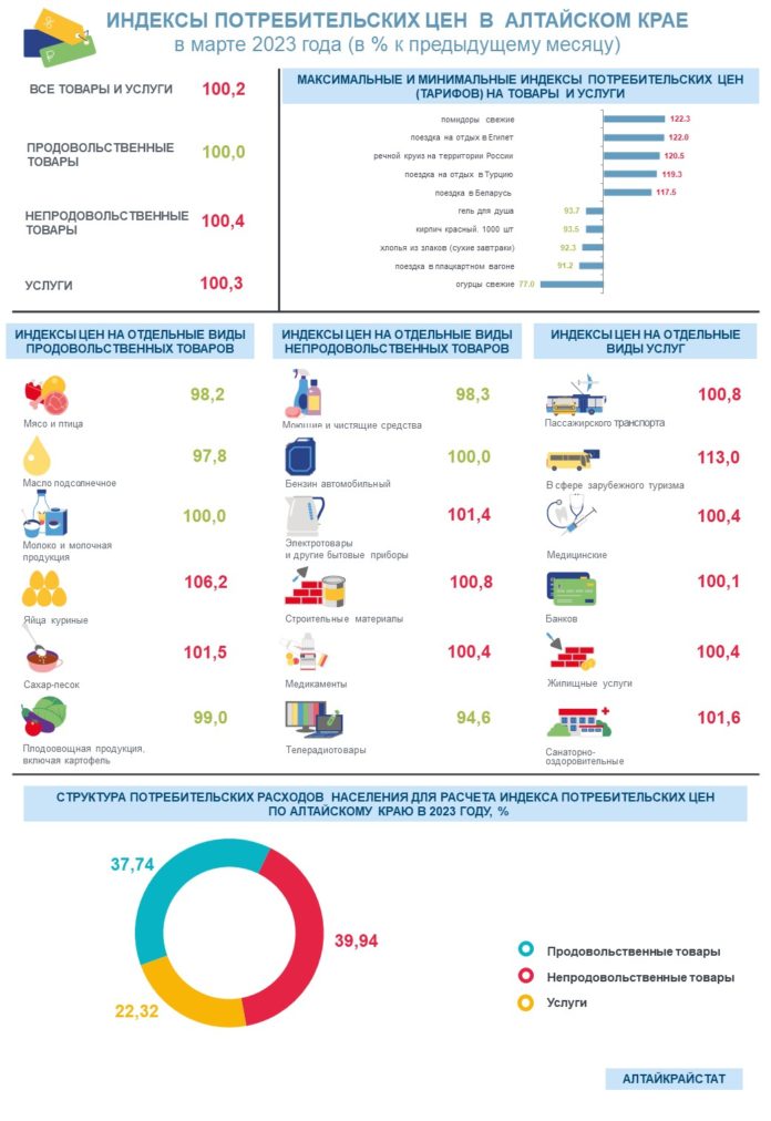 | В марте 2023 года индекс потребительских цен в Алтайском крае составил 100,2%. За март текущего года цены на продовольственные товары остались на прежнем уровне, на непродовольственные товары – выросли на 0,4%, стоимость услуг увеличилась на 0,3%. |