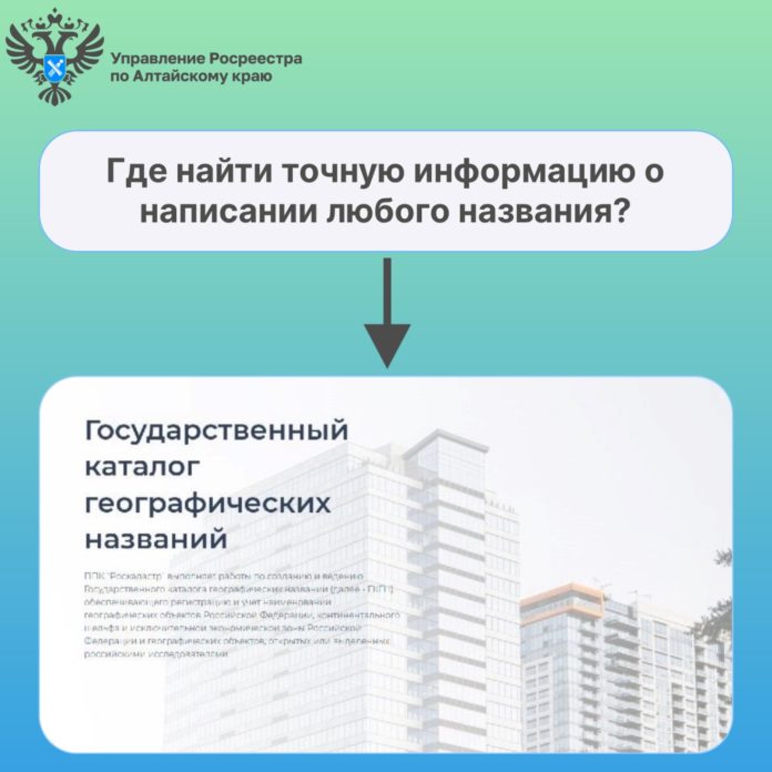 Управление Росреестра по Алтайскому краю информирует, что в целях обеспечения единообразного и устойчивого употребления в России наименований географических объектов и сохранения указанных наименований Росреестром создан государственный каталог географических названий (ГКГН). Оператором ГКГН является публично-правовая компания «Роскадастр» (ППК «Роскадастр»).