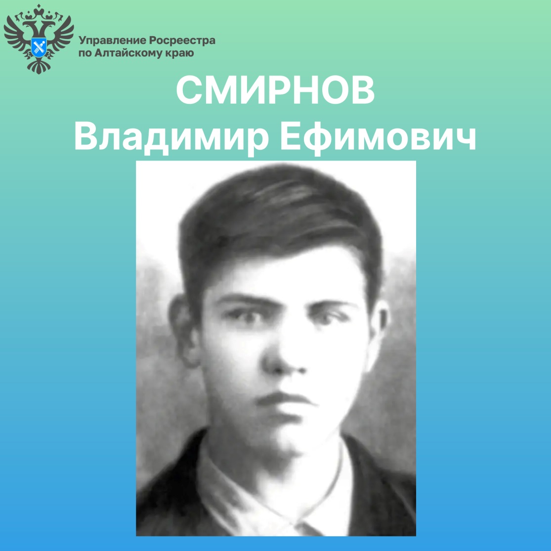 Родился Владимир Ефимович Смирнов в Барнауле, в семье рабочего. Работал токарем на эвакуированном в Барнаул станкостроительном заводе, одновременно учился в аэроклубе. В 1942 году, когда ему было 17 лет, Владимир Смирнов уехал в школу младших командиров, а оттуда – на фронт. Командовал минометным расчетом. Воевал на Калининском и 1-м Прибалтийском фронтах, был ранен. Не дождавшись полного излечения, вернулся из госпиталя в свою часть. Геройски погиб в ходе наступления на территории Белоруссии. Находясь с отделением на правом фланге роты, Владимир Смирнов неожиданно обнаружил сидевшего в засаде немецкого пулеметчика, собиравшегося открыть огонь. Володя бросился на пулемет и закрыл его своим телом. В Барнауле на доме № 31 по Социалистическому проспекту, где жил Владимир Смирнов, установлена мемориальная доска, перед зданием станкостроительного завода и в цехе, где он работал до призыва в армию, — бюсты Героя.