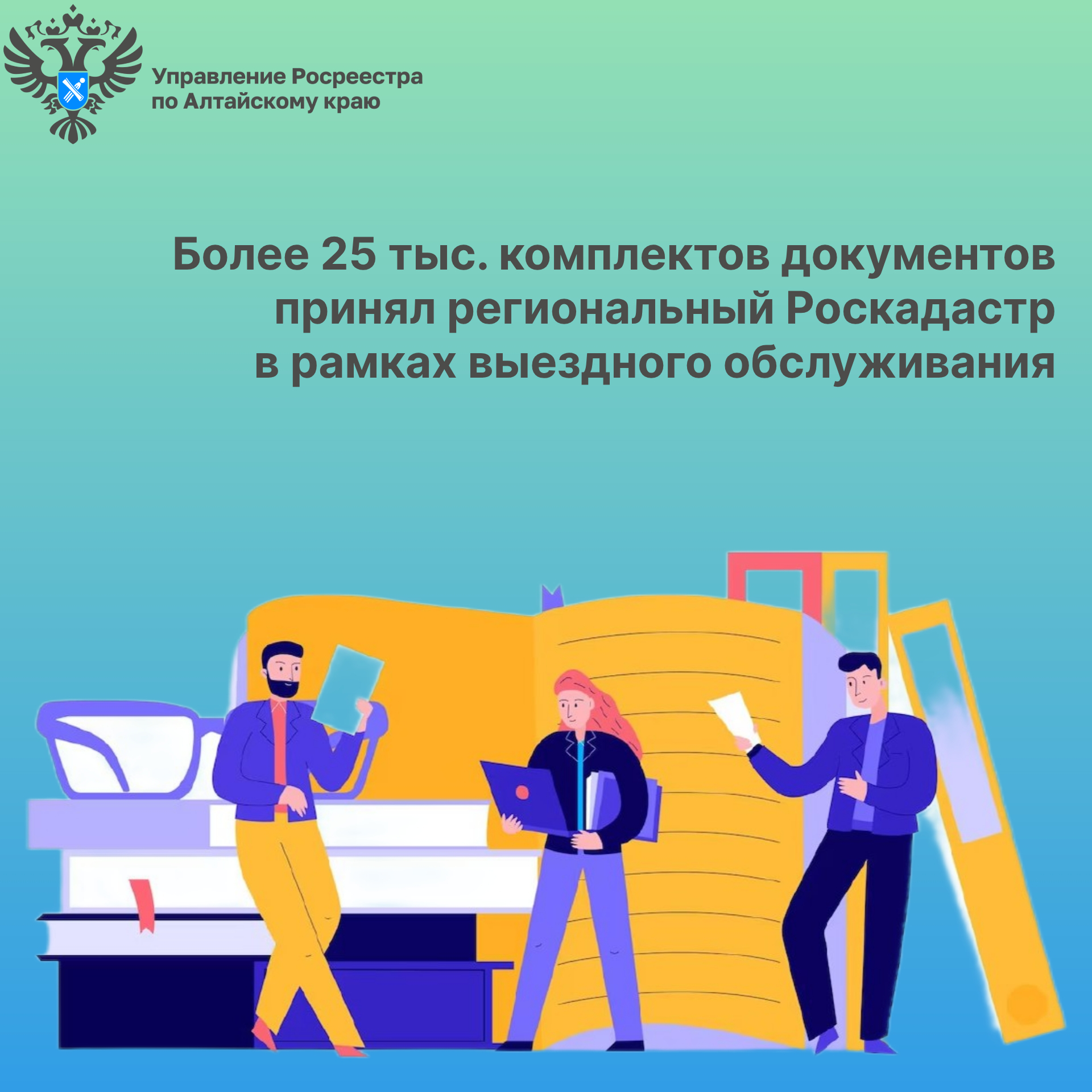 За 10 месяцев 2023 года в рамках выездного обслуживания специалисты Роскадастра по Алтайскому краю приняли более 25 тысяч пакетов документов для проведения кадастрового учета и регистрации прав, выдали 3 тыс. запросов о предоставлении сведений из Единого государственного реестра недвижимости (ЕГРН). 1,5 тыс. жителей Алтайского края обратились за предоставлением информационных, справочных, аналитических и консультационных услуг.