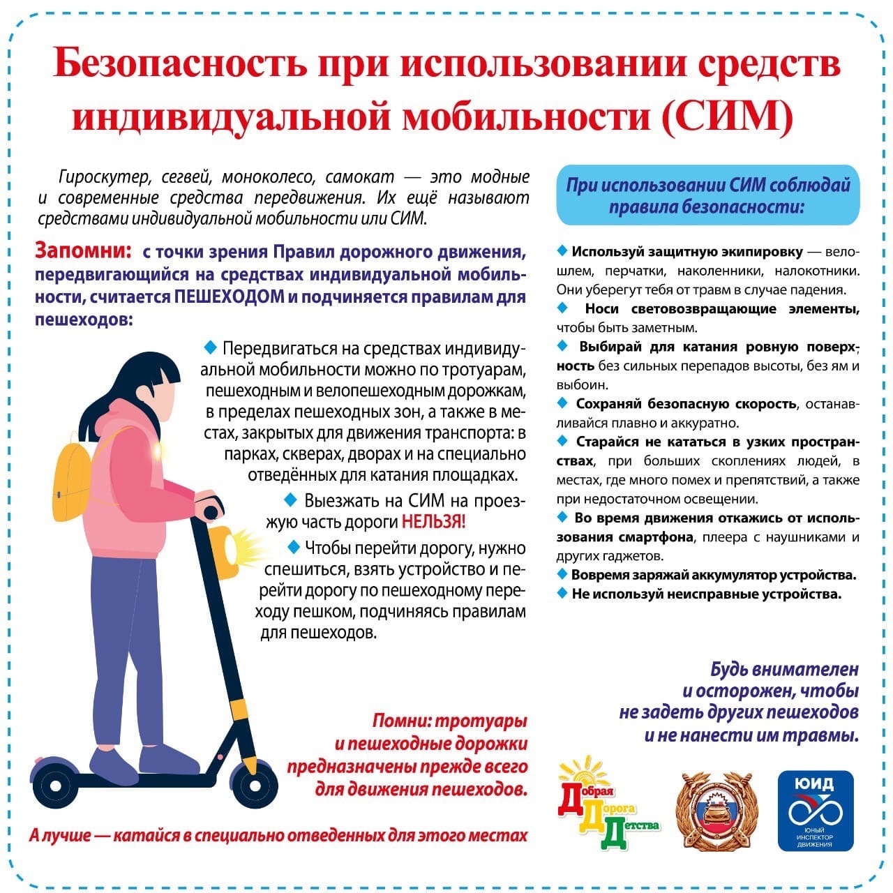 В связи с возрастающей популярностью мобильных средств передвижения, в особенности электросамокатов необходимо помнить и знать, что водители самокатов, как и других средств индивидуальной мобильности, по ПДД приравнены к пешеходам, а значит должны перемещаться по тротуарам, пешеходным и велодорожкам. Если тротуаров или дорожек нет, двигаться по обочинам дорог или по краю проезжей части. Ездить по тротуару следует с такой скоростью, чтобы не мешать движению пешеходов. Рекомендуется использовать шлем и защитную амуницию, а в темное время суток необходимо иметь на одежде светоотражающие элементы.