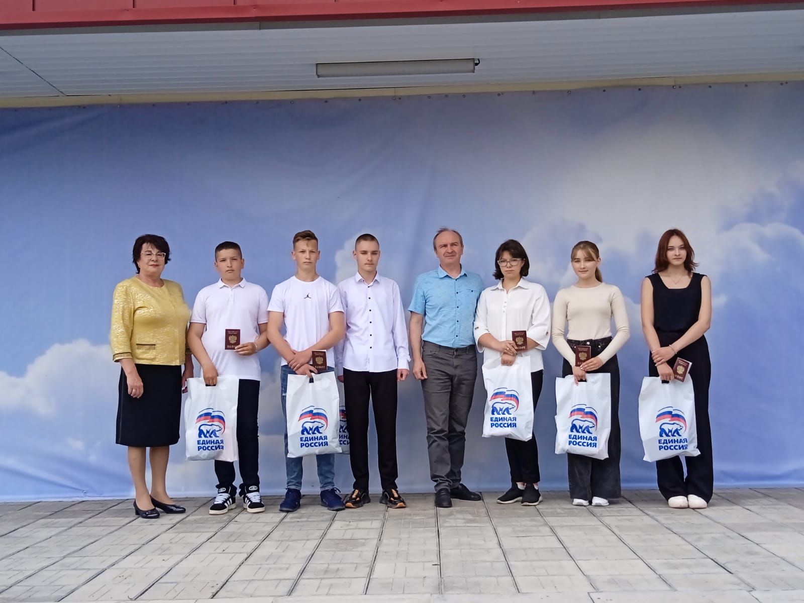 Паспорт гражданина Российской Федерации им вручают Светлана Николаевна Дудкина – председатель районного совета депутатов, секретарь Топчихинского местного отделения Всероссийской политической партии «ЕДИНАЯ РОССИЯ», Александр Александрович Назаренко – заместитель главы Администрации Топчихинского района. Они пожелали ребятам ярких красок в жизни и счастливых надежд, светлого будущего, всегда быть полными сил, энергии и желания исполнять свои мечты и достигать высот.