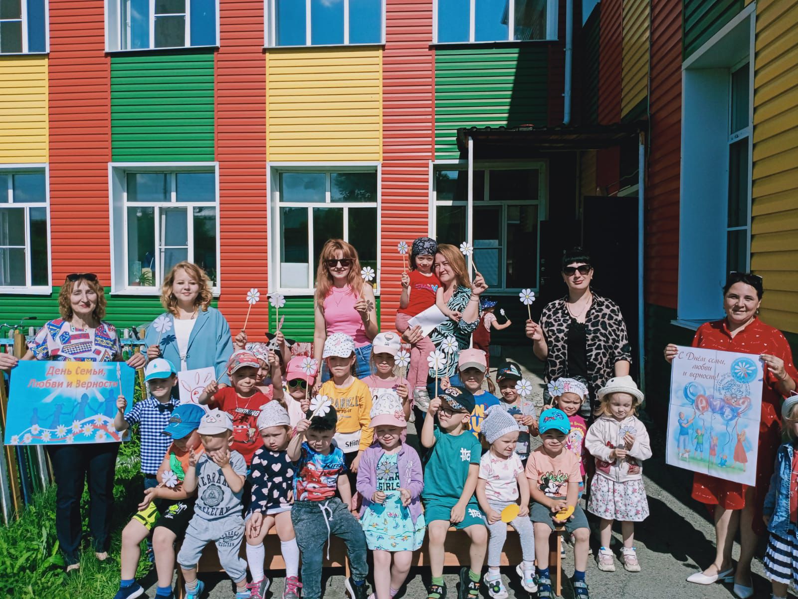 Праздник под названием «Знамя семьи – любовь» прошёл и в детском саду «Солнышко». Дети вместе со своими родителями с удовольствием приняли в нём участие. Они рисовали герб своей семьи, называли те качества, которые делают семью дружной, сплочённой. А как увлечённо собирали дети и взрослые лепестки простого цветка — ромашки, из которых получился символ семейного праздника! Дружные семьи, справившись с заданием, в награду получили медали.