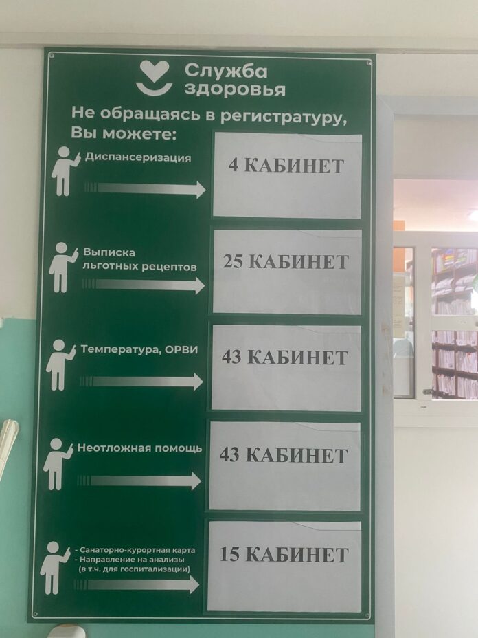 Кабинет #25 — выписка льготных рецептов. Кабинет #43 — неотложная помощь, температура, симптомы ОРВИ.