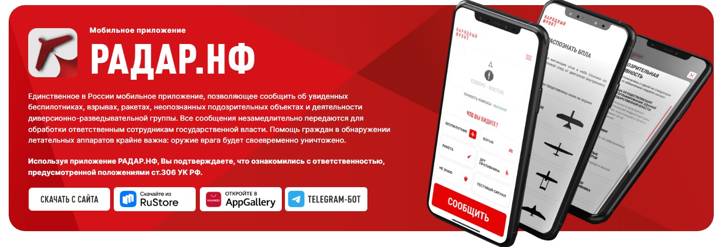 Для информирования силовых структур об угрозах применения беспилотных воздушных судов, обнаруженных гражданами, Общероссийским народным движением «НАРОДНЫЙ ФРОНТ «ЗА РОССИЮ» разработано мобильное приложение «Радар.НФ».