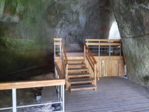 В рамках второго этапа благоустройства в пещере были обустроены настилы и лестницы, смонтированные с учетом сохранности археологических слоев. Центральный раскоп закрыт прозрачным поликарбонатом, что позволяет, с одной стороны, защитить его, с другой – сделать доступным для обозрения. Кроме того, установлены дополнительные конструкции безопасности, а также разработан проект по предотвращению разрушений в районе дымохода.
